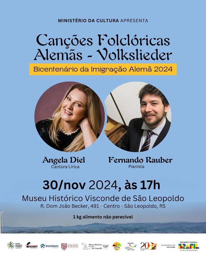 Apresentação acontece no Museu Histórico Visconde de São Leopoldo, quando a cantora lírica Angela Diel e o pianista Fernando Rauber interpretam canções tradicionais entre os imigrantes de origem germânica e obras de Schubert, Schumann e Brahms